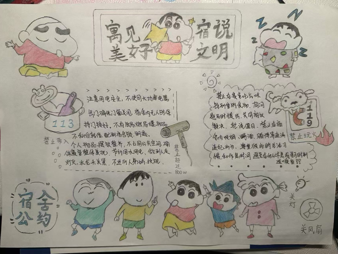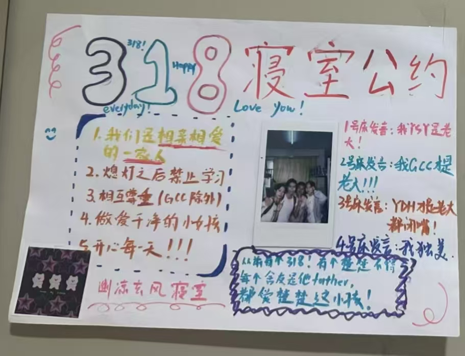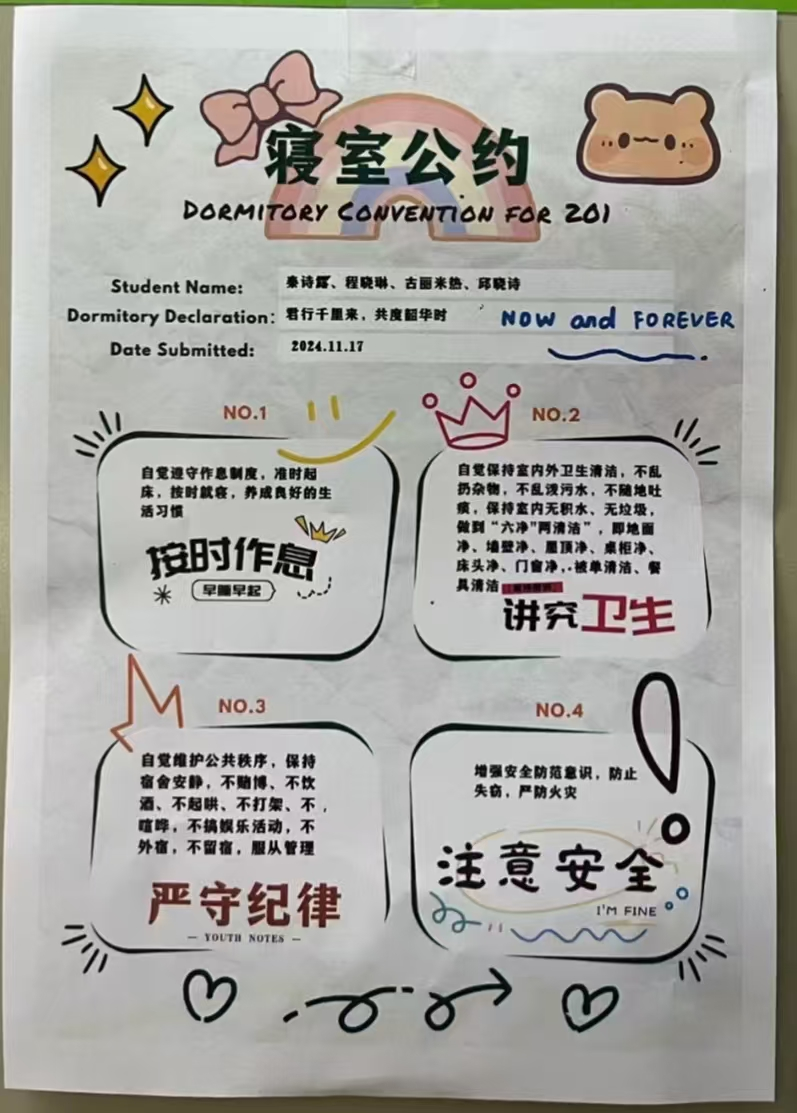 为加强宿舍文化建设,提升团队合作意识,构建更加和谐、有序的宿舍生活环境,beat365中文官方网站生活权益部于2024年11月14日策划并成功举办寝室公约设计活动。beat365中文官方网站全体在校生参与此次活动。