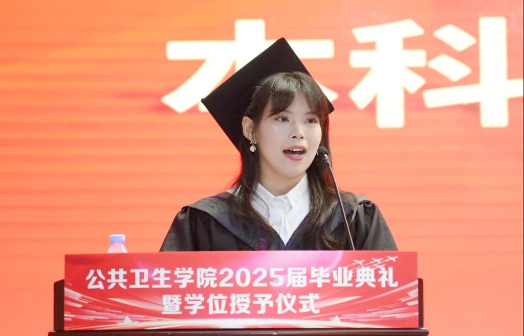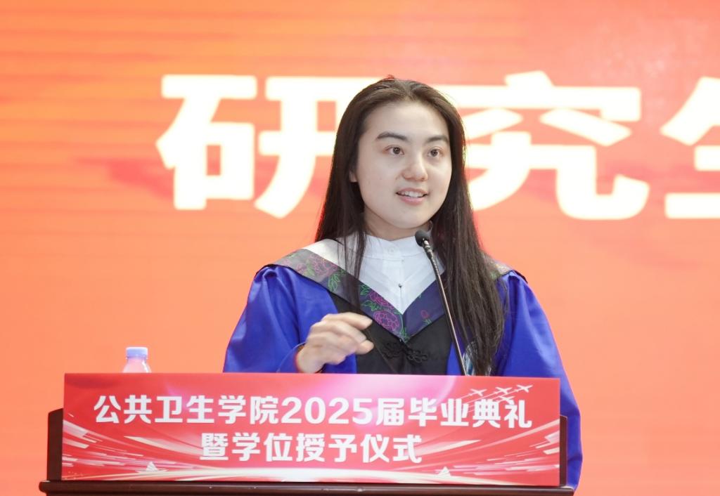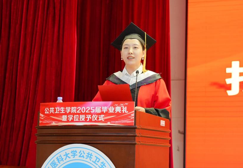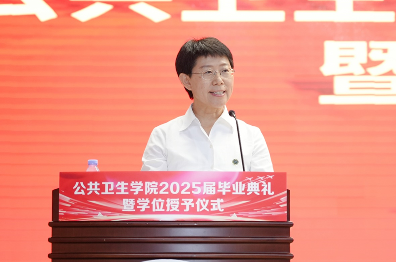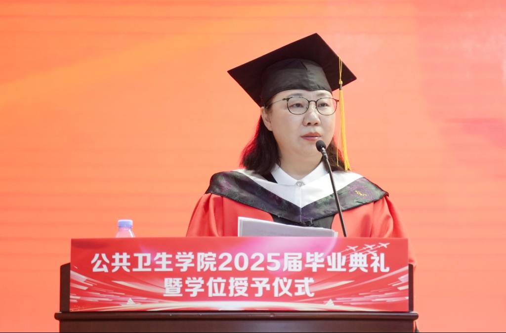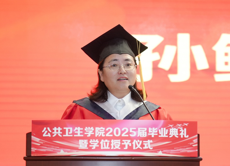 孙鲜策代表学院向圆满完成学业的毕业生致以热烈祝贺,并分享了自己求学时的难忘片段,以此引出对青春感悟的思考。她以三条成长路径寄语毕业生:一是“向上生长”,勉励同学们坚守科学精神、勇于推倒重来,以热爱与担当面对挑战,在顺逆之境中保持良知与尊严;二是“向下扎根”,强调公卫人的价值在于立足人民需求、扎根平凡岗位,无论身处实验室或基层,都应如疫苗般无声守护,永葆服务健康事业的初心;三是“归家之路”,提醒毕业生珍视家庭,承担起为人子女、伴侣与父母的责任,让爱成为前行的力量与归航的港湾。最后,院长深情祝福毕业生心途坦荡、执着追光,前程锦绣、幸福安康,脚下有路、心中有光。