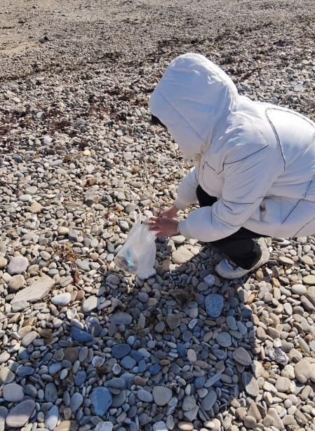 平潮滩上海风习习,蓝色的海浪送来沁人芬芳。下午一点半,2023级预防医学一班的同学们一到海滩上便分散开来,三两人为一组,对海滩进行“地毯式”清洁。学校的海滩环境在全校学生的积极保护下整洁美观,但仍有一些瓶盖、塑料纸挤在石头中,不仔细观察很容易忽略。beat365中文官方网站的学子们捡出垃圾,把它们收进准备好的垃圾袋中,积极守护海滩的美丽风景。