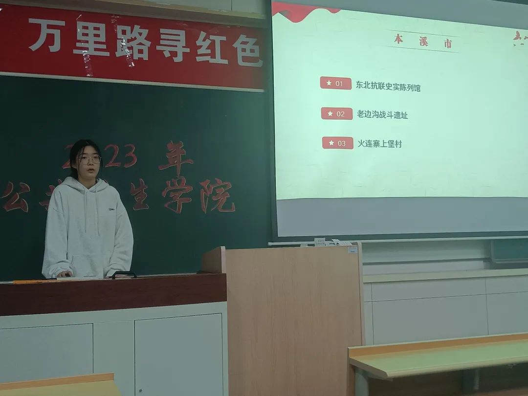 红色研学实践团队队员刘雨珊同学对“传中国特色,承党的初心”队组的实践结果进行了展示汇报。团队前期通过对高校学生的问卷调查和数据分析,调查了人群对党史知识和文化常识的了解现状以确定实践目的,随后走进陕西省,河南省,辽宁省,贵州省,河北省五省纪念馆和博物馆,实地考察感受。交流总结了党的伟大革命精神,学习体悟了中华优秀历史文化,深切感受到了今天和平安宁的来之不易,更加坚定自己肩上的责任和使命,也深刻领悟到了青年是新时代的奋斗主力军,不仅要赓续传统文化,也要不忘初心。实践成员许下了作为新时代接班人“不忘初心,牢记抗战英雄丰功伟绩”的铮铮誓言。