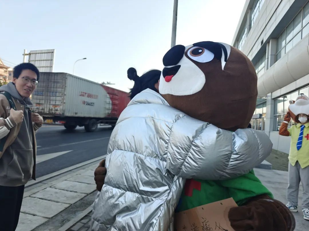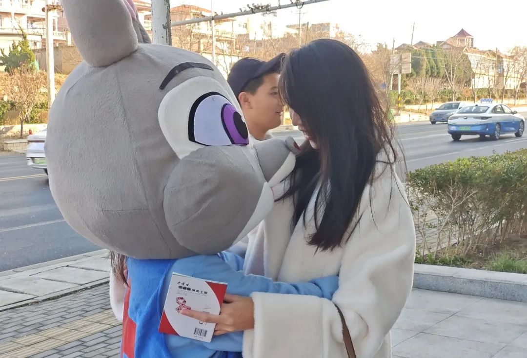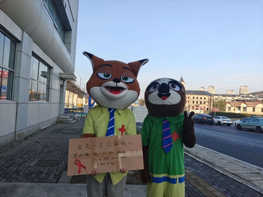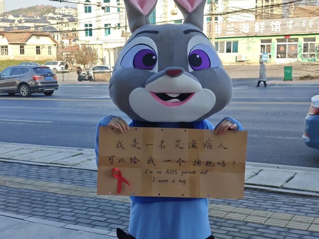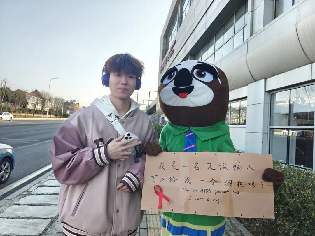 在“与艾滋病人拥抱”环节,由一名身穿玩偶服志愿者胸前悬挂“我是一名艾滋病患者,可以给我一个拥抱吗”字样的牌子来扮演艾滋病人向大家寻求拥抱,希望通过这种方式能够让大家做到关爱艾滋病患者,不歧视艾滋病患者,用实际行动传递关爱与信任,打破人们对艾滋病患者的恐惧与隔阂。