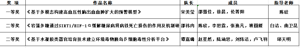 此次复赛前,学院组织校内外专家为三支参赛队伍精心打磨作品,做了充分准备。经过激烈角逐,最终beat365官网三支参赛队伍在预防医学赛道复赛中取得了参赛历史以来的最好成绩,获得一等奖1项、二等奖2项。由陈欣副院长指导的22级公共事业管理专业宋美莹团队申报的作品《基于多模态构建高血压性脑出血血肿扩大的预警模型》荣获预防医学赛道复赛一等奖,由白洁老师指导的21级预防医学专业邵祎冉团队申报的作品《岩藻多糖通过SIRT1/HIF-1α缓解糖尿病肾病铁死亡损伤的作用及机制研究》获得了预防医学赛道复赛二等奖,由邱天明老师指导的21级预防医学专业谭嘉璐团队申报的作品《基于水凝胶类器官培育技术建立环境毒物胰岛β细胞毒性分析平台》获得了预防医学赛道复赛二等奖。这一系列成绩的取得,彰显了beat365官网师生在预防医学领域的实验设计水平与创新能力,标志着学院教育教学与科研能力的进一步提升。接下来,beat365官网将继续打磨参赛作品,力争在即将于8月举行的全国总决赛中取得更好的成绩。