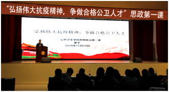姜平从“壮丽逆行,攻坚克难,‘抗疫精神’熠熠生辉”、“‘不忘初心、牢记使命’,在战疫中锤炼党性”、“党建引领,群防群治,基层党组织在战疫中勇担重任”和“发扬‘抗疫精神’,为实现中华民族伟大复兴而努力奋斗”四个方面进行了细致阐述。列举了我国在抗击疫情过程中的伟大成果和我校援颚医疗队决胜雷神山的无畏无惧,致敬一往无前、默默奉献的英雄们,讲述了共产党人以人民为中心的初心使命,鼓励全体公卫学子传承弘扬伟大抗疫精神,学好专业本领,树立远大理想,听党话,跟党走,努力成长为符合新时代要求的合格公卫人才,为我国的公共卫生事业发展贡献力量。