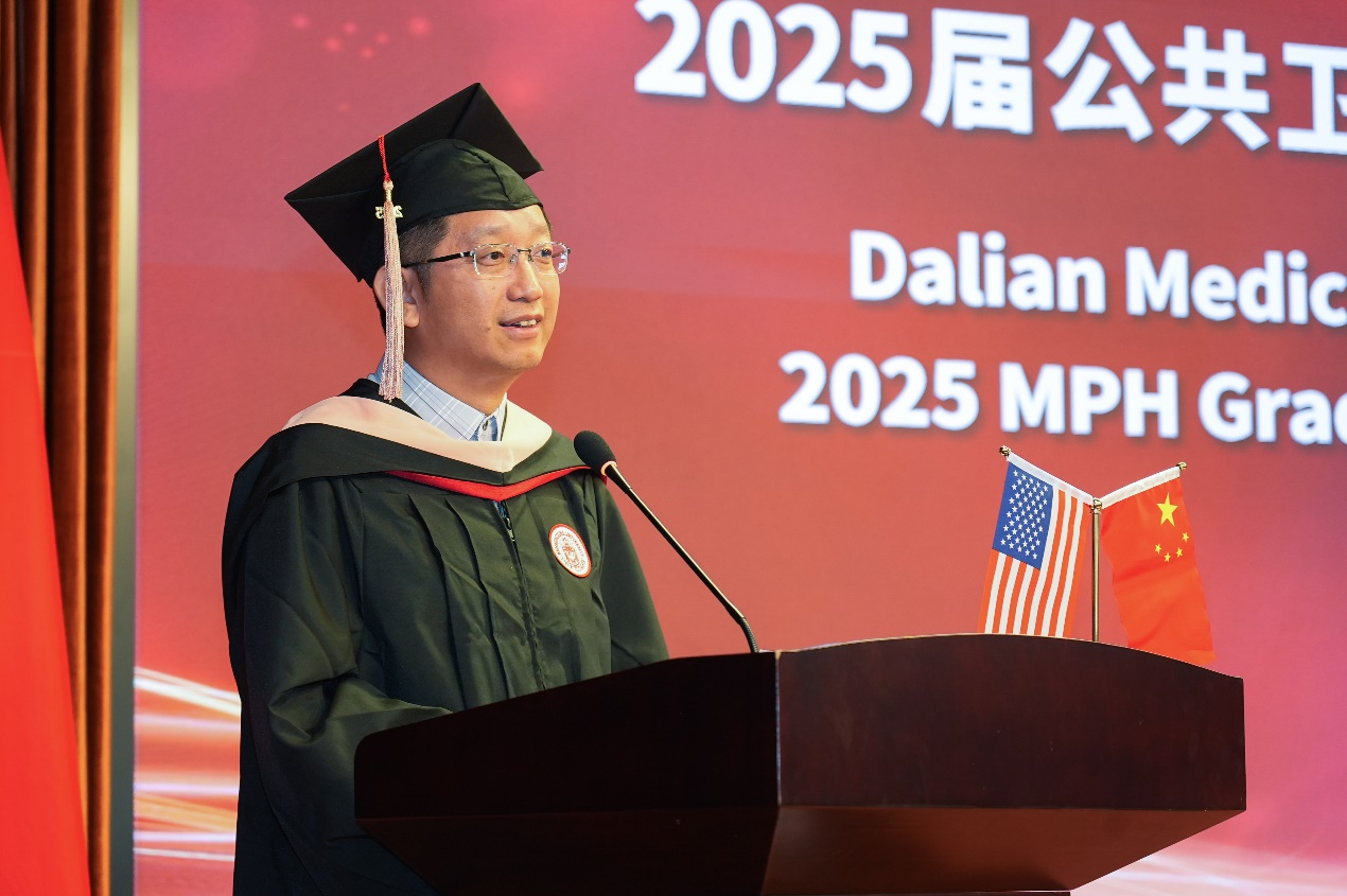 优秀校友代表、大连市第七人民医院老年病房主任姚烨发言。他向毕业生致以祝贺,并回顾了在MPH项目课程学习与学术讨论的收获,强调公卫人需牢记使命、投身实践。他结合工作经验提出三点建议:保持学习、注重合作、敢于探索。他寄语毕业生将毕业视为新起点,牢记公卫人的使命责任,在各自领域拼搏奋斗。最后,他祝福beat365中文官方网站与美国班尼迪克大学发展蒸蒸日上,师生皆展美好前程。