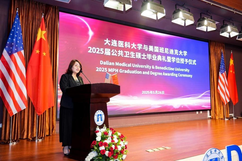 邵淑娟首先致辞。她向毕业生表示热烈祝贺,向中美教师团队、支持项目发展的各界朋友致以敬意和感谢。她强调公共卫生事业在全世界的重要性,希望毕业生牢记初心使命,以“健康所系、性命相托”的信念践行公卫人的责任担当,为中外公共卫生事业贡献自己的“中国智慧”。最后以“志在青云,行在实地”“学无止境,进无终途”“饮水思源,铁肩担义”三句话与毕业生共勉,期望他们将个人成长与国家发展结合,保持终身学习,感恩担当,并欢迎毕业生常回母校,祝愿他们前程似锦,在公共卫生领域绽放光彩。