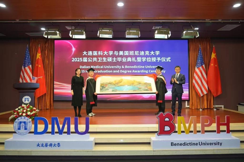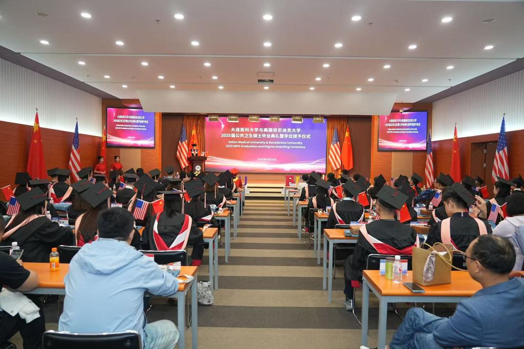 5月24日,我校与美国班尼迪克大学2025届公共卫生硕士毕业典礼暨学位授予仪式隆重举行。经过两年的辛勤学习,78名毕业生顺利获得美国班尼迪克大学硕士学位。美国班尼迪克大学校长Joseph J. Foy博士亲赴我校参加毕业典礼。我校副校长邵淑娟、beat365中文官方网站院长孙鲜策、国际教育学院副院长高鹏、beat365中文官方网站副院长陈欣、中美合作MPH项目的授课教师、教学督导代表和毕业生等共同出席本次典礼。典礼由孙鲜策主持。