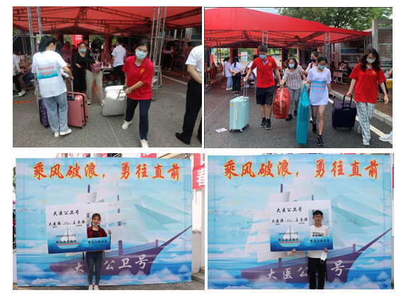 为确保迎新工作顺利进行,学院召开了迎新工作专题会议,为每位入学的2020级新生配备了带寝导生和2对1的迎新志愿者点对点迎接人员,建立并规范了一条为新生服务的流水线,信息核对、材料发放、保险缴费等均有专人负责,各司其职。学院在校园内搭建了凉棚,设立引领点,对到校新生进行引导,提供服务站点,并在寝室楼外悬挂了迎新条幅,学院还为新生精心准备了“大医公卫号”展板,希望公卫学子踏上“公卫号”,乘风破浪,勇往直前,驶向美好未来的港湾。