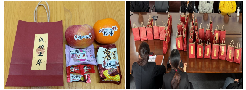 学院精心为每位考研学子准备了“考研加油包”,每一份礼物背后都有其独特的意义:在考研这条充满挑战的道路上,愿考研学子都能“心想事橙”,所有的心愿都能实现;在考研的征途中,每一步都能繁花似锦,绽放光彩,收获一路的美好与成功,走出自己的“一路生花”;“苹稳上岸”是对考研学子们最殷切的期盼,祝愿能够顺利抵达梦想的彼岸;“薯愿薯愿,属你所愿”,所有的好运都属于你们,每一个愿望都能够成真,在考研中取得理想的成绩;“旺仔糖”象征着旺盛的精力和满满的元气,希望学子们在备考和考试时都能精神饱满,充满力量,好运旺旺旺;“小德芙”寓意着在考研路上能够得到福气,巧克难题,取得成功!