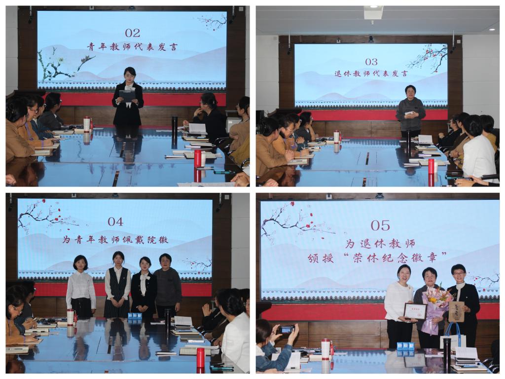 在“青丝白发传承礼”环节,营养与食品卫生学教研室教师耿睿璇代表新入职教师发言,教研室退休教师刘晓芳教授分享了四十余年如一日守护公卫使命的坚实步履。随后,刘晓芳教授为新入职教师佩戴了院徽,学院领导为刘教授颁发了荣休纪念章,学院副院长陈欣进行了总结发言。