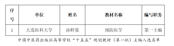 根据中国中医药出版社高等学校“十五五”规划教材(第一批)编者遴选工作安排,经学院申报、学校推荐、专家评审等相关程序,beat365官网孙鲜策教授遴选为中国中医药出版社《预防医学》规划教材第一主编。